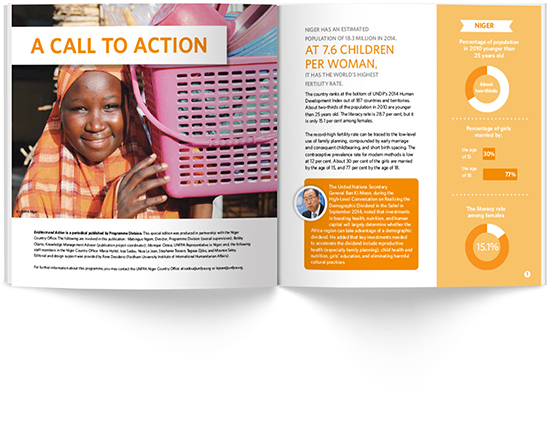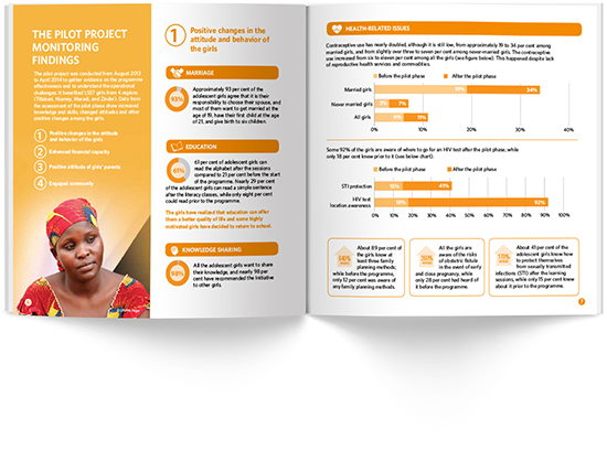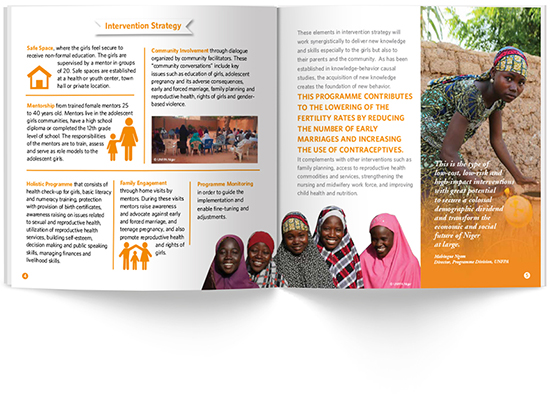 The Niger Adolescent Girls Initiative: Accelerating the Demographic Transition brochure is a short saddle-stitched booklet that offers the reader information about the challenges that face the country of Niger and the project’s strategy of investing in girls to produce positive change for Niger. The simple infographic style and layout of the pages makes this piece easy to read and clearly explains the programs focus.